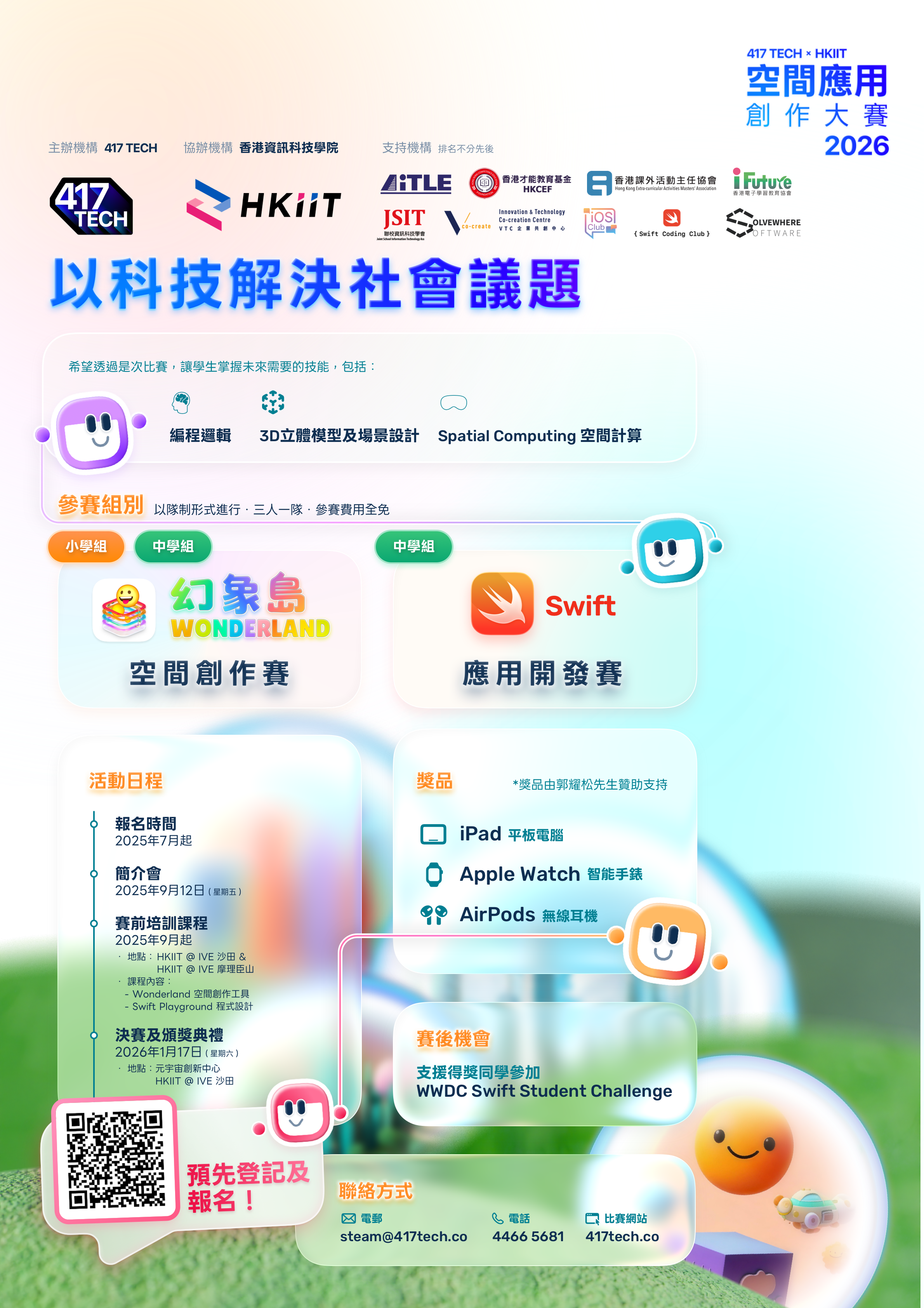 🔥 HKIIT 空間應用創作大賽2026 全新登場!由 417 Technology Limited 與 HKIIT 攜手舉辦,為學生提供展示創意的舞台!這次比賽不僅讓學生能發揮創意和技術,還能獲得真實的實戰經驗,為參加 WWDC Swift Student Challenge 做好準備!✨